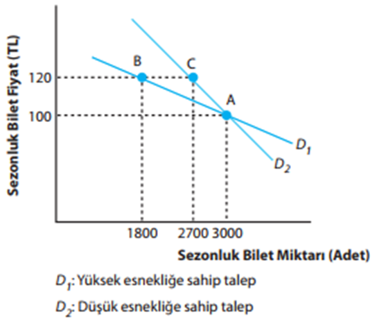 Profesyonel bir futbol takımının sezonluk bilet satışları için olası iki talep eğrisi çizilmiştir. Çizimde yatay eksende talep edilen bilet miktarı, düşey eksende ise bir sezonluk biletin fiyatı yer almaktadır. Her iki talep eğrisi de A noktasından geçmektedir. Bu noktada bir sezonluk biletin fiyatı 100 TL dir, bu fiyattan sadece 3000 Kisi bilet almaktadır. Nispeten daha yatık D1 talep eğrisine göre talep miktarı (bilet alanların sayısı) fiyata karşı oldukça duyarlıdır. Bir başka deyişle talep eğrisinin esnekliği yüksektir. Grafikteki örnekte sezonluk bilet fiyatı %20 arttığı zaman, bileti talep edenlerin sayısı (talep edilen miktar) %40 oranında azalmaktadır. Talep eğrisi üzerinde A noktasından B noktasına geçilmiştir.