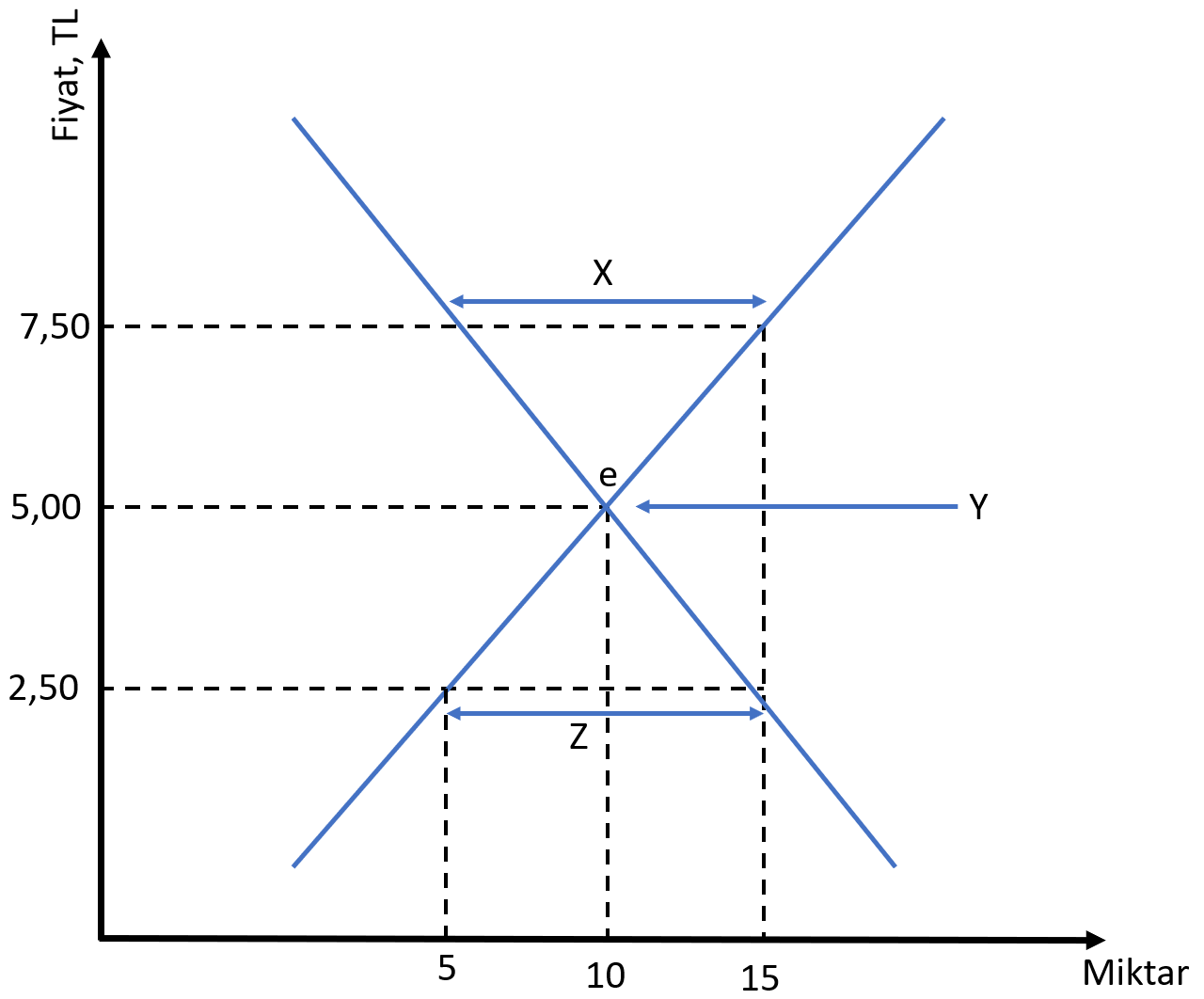 Burada herhangi bir mal için çizilen arz ve talep eğrilerinin kesiştiği e noktasında bu malın piyasasında denge oluşmaktadır. Bu noktada talep edilen mal miktarı ile arz edilen mal miktarı birbirine eşittir. Grafikte, arz edilen mal miktarının 15 adet ile talep edilen mal miktarı olan 5 adetten fazla olması durumu aşırı arz ya da artık olarak nitelendirilir. Bu fiyat düzeyinde, aşırı arz ya da artığın ortaya çıkması üreticiler tarafından piyasaya sunulan malların bir kısmının alıcı bulamadığı yani satılamadığı anlamına gelmektedir. Piyasada geçerli 2,50 TL fiyat düzeyinde talep edilen mal miktarı 15 adet iken arz edilen mal miktarı 5 adettir. Bu şekilde talep edilen miktarın arz edilen miktardan fazla olması durumunda aşırı talep ya da kıtlık ortaya çıkmaktadır. Aşırı talep ya da kıtlık durumunun varlığında, tüketiciler satın almak istedikleri miktarda mal satın alamazlar. Bu koşullar altında tüketiciler bu malı elde etmek isteklerinden ötürü, mala piyasada oluşan fiyattan daha fazla fiyat ödeyerek sahip olmak isterler. Bu nedenle cevap C'dir.