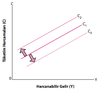 Tüketim fonksiyonu cari gelirin bir fonksiyonu iken, tüketim harcamalarını gelir dışındaki faktörler de etkiler. Servetteki artış veya azalışlar, faiz oranlardaki artış veya azalışlar ve geleceğe yönelik beklentilerdeki iyimser veya kötümser değişimler hane halklarının aynı gelir düzeyinde daha az veya daha fazla harcama yapmasını etkiler. Bu unsurlarda meydana gelen bir değişiklik tüketim fonksiyonunun topyekün yer değiştirmesine, aşağı veya yukarı kaymasına neden olur. Ancak gelir düzeyindeki değişiklik aynı tüketim fonksiyonu üzerinde harekete yol açar.