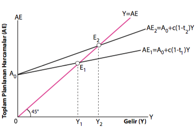 Gelir vergisi oranındaki toplam harcama fonksiyonunun eğiminin artmasına, diğer bir deyişle eğrinin dikleşmesine neden olur. Gelir vergisi oranındaki azalma harcanabilir geliri artırarak tüketimin artmasına, buna bağlı olarak toplam harcamaların artmasına ve gelirin artmasına yol açmıştır. Diğer otonom harcamalardaki değişmeler fonksiyonun topyekün yer değiştirmesine neden olur.