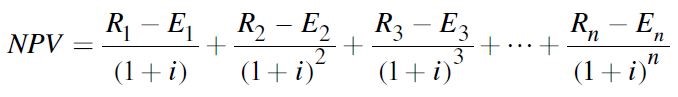 NPV net bugünkü değeri, R1, R2, R3… her dönem elde edilecek hasılatı veya nakit girişini; E1, E2, E3 her dönem gerçekleşen harcamaları veya nakit çıktısını göstermektedir. Formüldeki i ise indirgeme faktörüdür. Bir yatırım projesinin net bugünkü değeri yukarıdaki formülle hesaplanır.