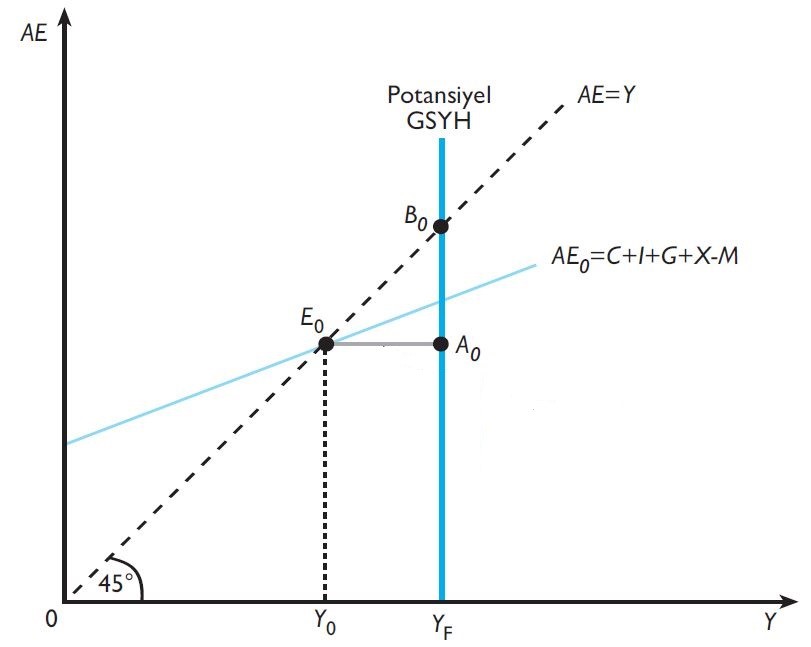 Grafikte, ekonomide yeterince toplam harcamanın gerçekleşmemesi nedeniyle, denge toplam gelir düzeyinin potansiyel GSYH düzeyinin altında kaldığı durum gösterilmiştir. Bu durumda E0-A0 aralığına kadar resesyona neden olan bir açık oluşur.