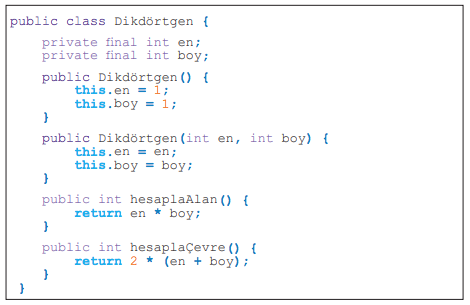 • Metot ismi (bu örneğimizde hesaplaAlan ve hesaplaÇevre). Genel olarak metot isimleri küçük harf ile yazılan bir fiil ile başlar. Eğer ikinci bir kelimesi varsa bu ikinci kelime büyük harf ile başlayan sıfat veya isim olur.