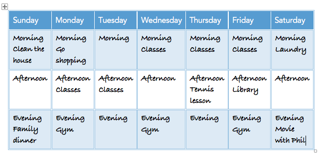 The following is Meredith's weekly planner. Answer the following question according to the weekly planner.