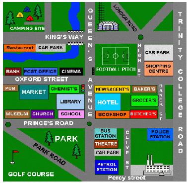 First, go _____ the camping site and go _____ on King’s way and make a right when you reach Queen’s Avenue. Go one block and turn left. Go another block and make a right again. It is _____your right, _____Baker’s and Butcher’s.