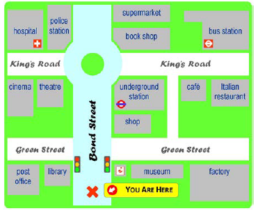 Soruyu aşağıdaki resme göre ve “you are here” (buradasınız) ifadesine göz önüne alarak yapınız.