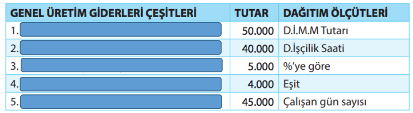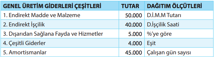 Yukarıda verilen tabloda, dağıtım ölçütlerinden "çalışılan gün sayısına" göre dağıtılan üretim gideri aşağıdakilerden hangisidir?