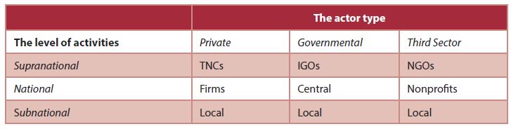 There is a two-way relationship between globalization and global governance, and the state is the crucial actor of global politics, whereas other actors supplement the role of the state. As seen in Table below governance activities based on both the levels where these activities take place and the type of the actor are categorized.