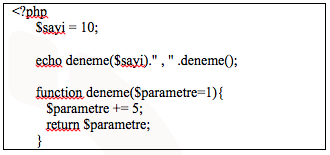 PHP kodlarında, fonksiyon tanımı function kelimesi ile yapılır ve fonksiyona bir isim verilir. Sorudaki örnekte, tanımlanan fonksiyonun adı "deneme"dir. Fonksiyon çağrıldığında, değer döndürmesi için return komutu kullanılır. PHP'de, fonksiyonlarda varsayılan parametre tanımlaması yapılabilir. Böylece fonksiyon çağrılırken parametre gönderilmediğinde fonksiyon içinde varsayılan değer kullanılır. Soruda verilen kod içerisinde, deneme fonksiyonu ilk olarak deneme($sayi) şeklinde çağrılmıştır. Bu durumda, fonksiyon içindeki $parametre değişkeni 10 olarak tanımlanacaktır. Daha sonra bu sayının 5 fazlası alınarak geri döndürülmektedir. Kod içerisinde, deneme fonksiyonu ikinci kez çağrıldığında herhangi bir parametre gönderilmediğinden $parametre 1 olarak tanımlanacaktır. Bu sayının da 5 fazlası geri döndürülecektir.