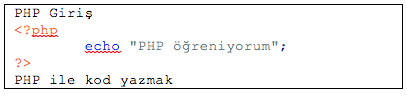 PHP derleyici, <?php…?> ifadelerinin arasında kalmayan hiçbir satırı derlemez. Bu ifadelerin dışındaki her şey, doğrudan çıktı olarak üretilir. Yukarıdaki satırların ilki, herhangi bir PHP kodu değildir. Dolayısıyla doğrudan istemciye gönderilir. İki ve dördüncü satırdaki ifadeler PHP kodlarının başladığını ve bittiğini belirterek, üçüncü satırın PHP derleyici tarafından derlenmesini sağlarlar. Bu satır echo deyimi sayesinde, Web sitesine “PHP öğreniyorum” içeriğini tırnak işareti olmadan ekler. Beşinci satır yine aynen gönderilecektir.