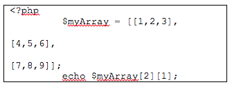Sorudaki verilen PHP kodunda, 3x3 boyutunda sayılardan oluşan bir dizi tanımlanmıştır. $myArray aslında 3 elemanlı bir dizi olarak tanımlanmıştır. Bu dizinin her bir elemanı ise yine 3 elemanlı başka dizileri barındırmaktadır. Sonuç olarak bu yapının 3x3 boyutunda bir dizi olarak tanımlandığı söylenebilir. Bu şekilde, diziler içinde çok boyutlu yapılar oluşturmak mümkündür. Bu dizide anahtar tanımlaması yapılmadığı için 0’dan başlayacak şekilde anahtarlar otomatik olarak belirlenmiş olur. Böylelikle, "echo $myArray[2][1];" satırı ile oluşturulan dizinin 3. satırının 2. elemanı gösterilmektedir.