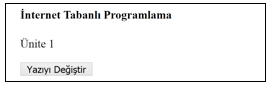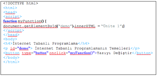 HTML kodunda yer alan <button ...</button> arasında kalan kısım incelendiğinde, buton üzerindeki yazının " Yazıyı Değiştir" şeklinde olması gerektiği görülür. Buna göre B, C ve E şıkları yanlıştır. Yine, onclick= "myFunction()" komutuna bakıldığında, butona basıldığında, "myFunction" isimli JavaScript fonksiyonunun çağrılacağı anlaşılır. Bu fonksiyon ise, "İnternet Tabanlı Programlamanın Temelleri" yazısını "Ünite 1" yazısına dönüştürmektedir.
