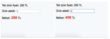 200TL fiyatlı bir ürün için, kullanıcının gireceği adet bilgisine göre toplam bakiyeyi hesaplayarak sayfaya yazabiliriz. Bu örnekte JS metin kutusunun değişim olayına tepki vererek, sayfadaki bir elementin içeriğini düzenlemektedir. Kullanıcının Ürün adedi kutusuna farklı değerler girmesi sonucunda sayfaya yazılan bakiye değeri değişmektedir.