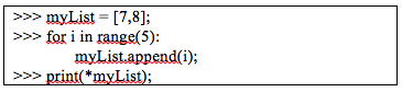 Soruda verilen kodun 1. Satırın [7,8] elemanlarını içeren bir liste tanımlanmıştır. 2. Satırda verilen “for i in range(i)”ifadesiyle i’nin 0’dan 4’e kadar olan değerleri için 3. satırda yazan kod döngü olarak çalıştırılacaktır. Python dilinde, listenin sonuna eleman eklemek için append fonksiyonu kullanılır. Bu göre 3.satırdaki append fonksiyonu her defasında myList listesinin sonuna yeni bir eleman ekleyecektir. Print fonksiyonunda * parametresi kullanılması durumda, listedeki elemanlar tek tek ve aralarına varsayılan olarak boşluk karakteri konulmuş olarak yazılır.