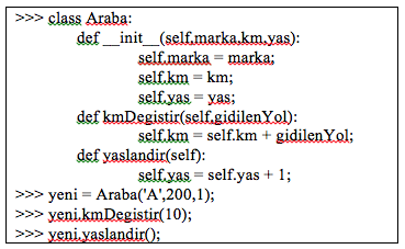 Python dilinde, sınıftan türetilecek nesnelerin değişken tanımları “__init__” isimli bir metot içerisinde gerçekleştirilir. Bu sebeple, "marka","km" ve "yas" bu sınıfın değişkenleridir. Onun dışındaki " kmDegistir " ve "yaslandir" metotları ise bu sınıfa eklenen metotlardır. Sınıf tanımlandıktan sonra gelen kodlarda, "yeni" değişkeni markası "A", km'si 200 ve yaşı 1 olan bir Araba sınıfı olarak tanımlanmıştır. Alt satırda, yeni'nin km'si 10 artırılmıştır. Bir alt satırda ise araba yaşlandırılarak, yaşı 1 artırılmıştır.
