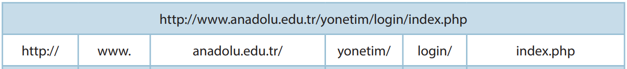 Yukarıdaki örnekte “anadolu.edu.tr” alan ve alan adı uzantısıdır. Burada "yonetim" ve "login" klasör, “index.php” web sayfası, "http" protokol ve "www" alt alanı ifade etmektedir.