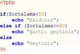 Yukarıda verilen PHP kodları öğrencilerin sınav ortalamalarına göre geçme-kalma durumlarını belirlemek için kullanılmaktadır. Buna göre verilen kodlar, ortalaması 60 olan Ayşe ve ortalaması 50 olan Ali için hangi sonuçları üretecektir?