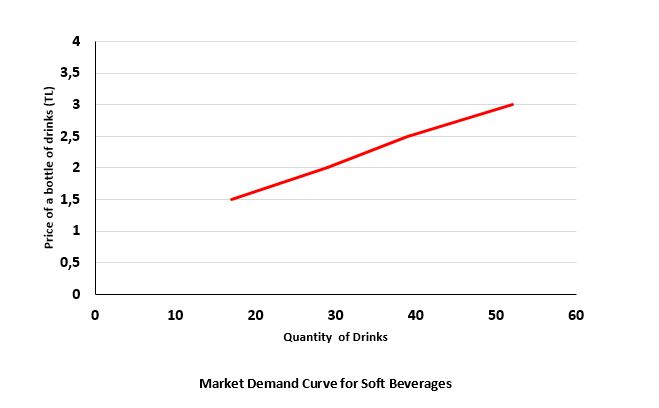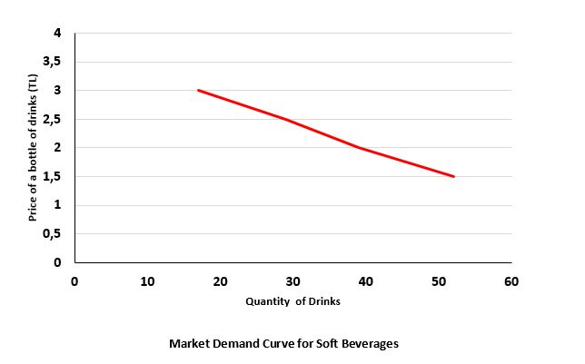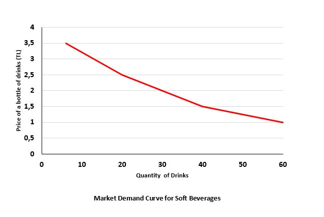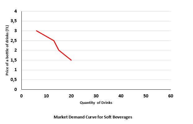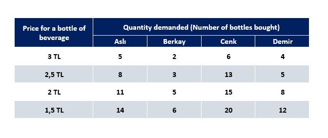 Market demand is the sum of all the quantities of a product demanded per period by all the buyers in the market. The market demand curve is found by adding horizontally the individual demand curves at all prices. Because there are hypothetically only four people in our market, we can reach the market demand by adding each individuals demanded quantity of soft drinks. That is, when drinks are 3 TL, 17 bottles of drink are demanded in total (5+2+6+4= 17). When they are 2,5 TL, 29 bottles of drink are demanded in total (8+3+13+5= 29). When they are 2 TL, 39 bottles are demanded in total (11+5+15+8= 29). When they are 1,5 TL, 52 bottles are demanded in total (14+6+20+12= 52). The correct answer is D.