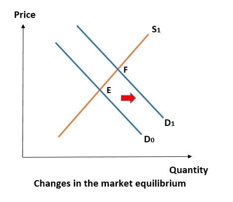 In our sample graph, the demand curve shifts to the right (from D0 to D1), so it illustrates the change in market equilibrium when the demand shifts. The graph shows that the market is initially in equilibrium at point E. When the demand increases, the demand curve shifts to the right and a new equilibrium is established in the intersection of the new demand curve and supply curve at point F. This point is characterized by a new price and a new quantity representing both demand and supply. This new price is of course higher than the initial price. The correct answer is A.