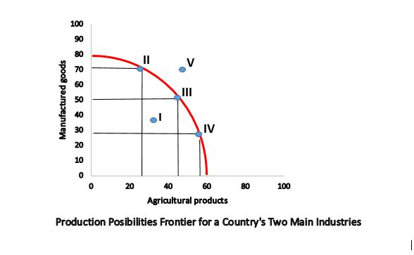 Production possibilities frontier is a graph that shows the combinations of output that a firm or a society can possibly produce using the available production technology and the given amount of inputs. Therefore, the Production possibilities frontier is a very useful analytical tool to illustrate the basic economic concepts such as scarcity, efficiency, tradeoffs and opportunity cost. Of course, whole economies in real life produce thousands of goods and services. However, our graph in the question is a simplified form as if there were only industries where all resources available to the economy are used. The points II, III, and IV show that the more manufactured goods are produced, the less agricultural products are produced, and vice versa. This shows that this country uses its all resources fully and efficiently. The point V, on the other hand, might show desirable production level, but it would be impossible to reach there with the given available resources and technology. The point I indicates a production level that this country would definitely avoid because this point shows that it is either using its scarce resources fully but inefficiently, or it is leaving some of the resources idle. The correct answer is A.