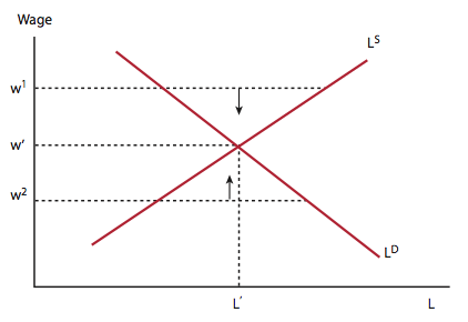 The figure shows the equilibrium in the Labor Market. If wage is w1, there is excess supply in the labor market. This means some workers who want to work at this wage level will be unable to find a job (unemployment). As a result, the wage will be driven down. On the other hand, if wages are as low as w2, workers do not want to work that much but firms demand more workers. So, there will be excess demand and the wage will increase. w* is the equilibrium or market-clearing wage where labor demand is equal to labor supply. At this wage level, L* is the amount of labor to be employed. In other words, if there is an imbalance in the labor market, wage adjusts and brings the market to an equilibrium. The correct answer is B.