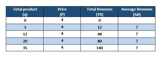 Average Revenue (AR) = Total Revenue (TR) / quantity (q)