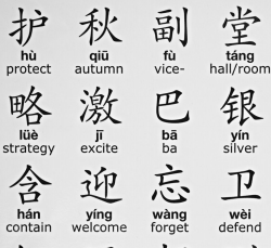 The basic stock of characters are simple graphs, some of which represent the names for objects or parts of objects, such as river, fish, man, and woman, and others of which stand for more abstract terms, such as yield, love, quarrel, prince, and the like. With some 40,000 graphs, the system comes close to the ideal of a fully explicit writing system that represents each distinctive unit of meaning with a distinctive unit of writing. Below is an example illustrating some Chinese characters representing individual words. The correct answer is B.