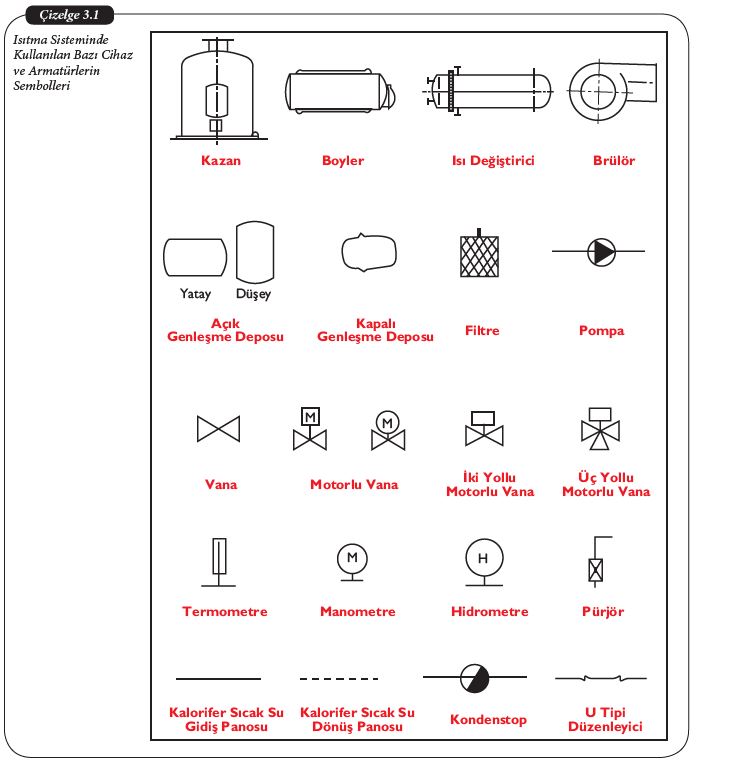 Isıtma sisteminde kullanılan bazı cihazların sembolleri aşağıdaki gibidir.