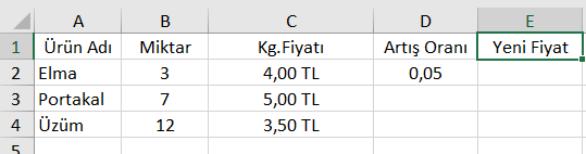 =C2+D2*C2 komutu ile %5 fiyat artışı ile yeni elma fiyatı hesaplanmış olur