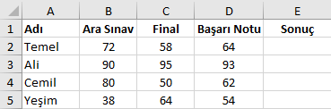Temel için E2 hücresine yazılacak olan =EĞER(VE(C2>=60;D2>=60);"GEÇTİ";"KALDI")