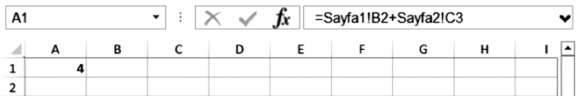 Görselde görüntülenen formül; Sayfa 1'deki B2 hücresindeki değer ile Sayfa 2'deki C3 hücresindeki değerlerin toplanması işlemini gerçekleştirir.