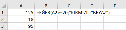 A2 hücresindeki değer 20'den büyük eşit olduğundan KIRMIZI yazacaktır.