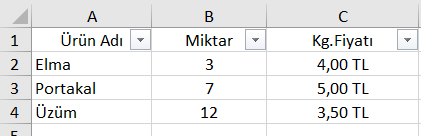 C1 hücresi Kg.Fiyatı barındırmaktadır. 4'den küçük olan verilere filtre uygulandığından, ekranda sadece Üzüm satırı kalır.