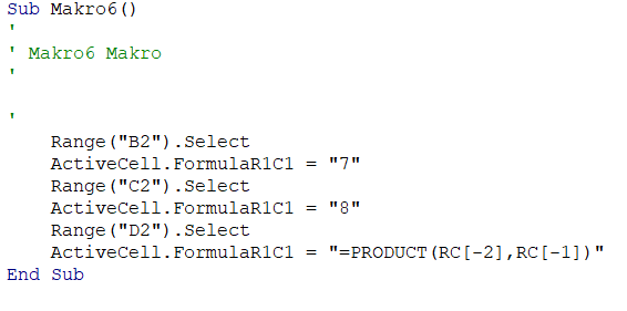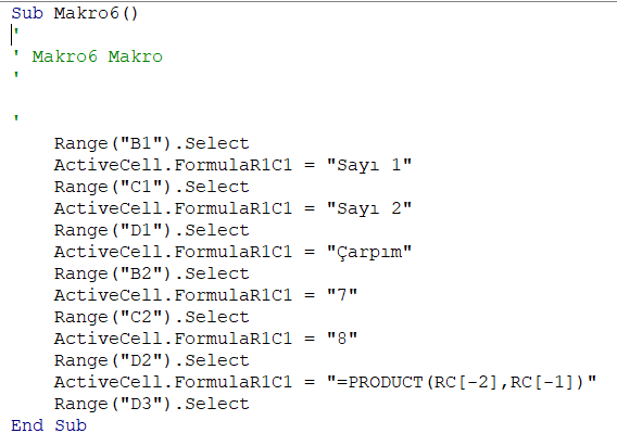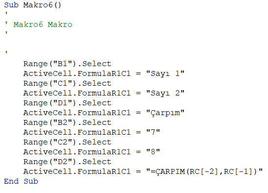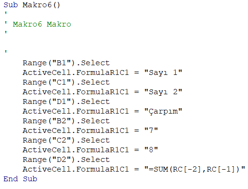- D şıkkında; B1, C1 ve D1 hücrelerine herhangi bir değer eklenmemiş. Makronun tamamen boş bir çalışma kitabında çalıştırıldığını göz önüne alırsak bu hücrelerin değerlerinin de VBA kodunda eklenmesi gerekmektedir.