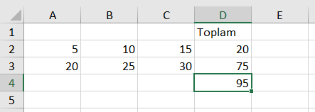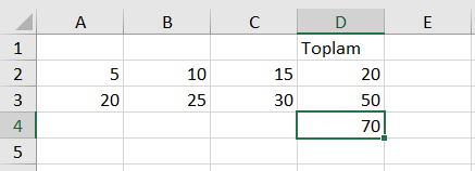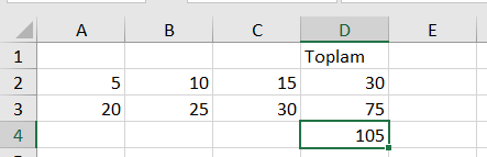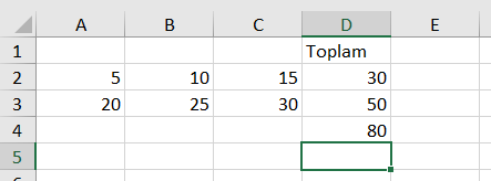 - D2 hücresi seçilir ve hücreye =TOPLA(A2:C2) formülü eklenir. Formülün sonucu A2, B2 ve C2 hücrelerindeki değerlerin toplamıdır. 5 + 10 + 15 = 30