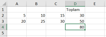 - Son olarak; D4 hücresi seçilir ve hücreye =TOPLA(D2;D3) formülü eklenir. Formülün sonucu D2 ve D3 hücrelerindeki değerlerin toplamıdır. 30 + 50 = 80