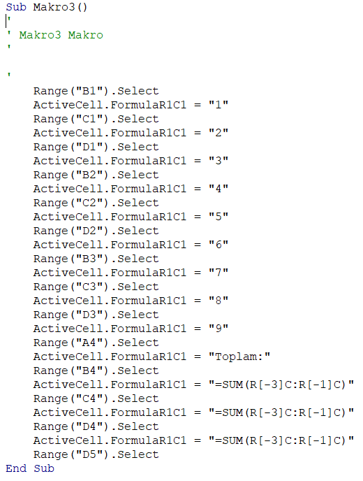 Görseldeki VBA dilinde yazılmış makro çalıştırıldığında C4 hücresinin değeri aşağıdakilerden hangisi olacaktır?