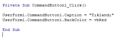 Caption özelliği bir nesneye ait başlığı ifade eder. İlk kod parçacığında; formda yer alan CommandButton1 nesnesinin başlığına yeni bir değer (Tıklandı) verilmektedir.