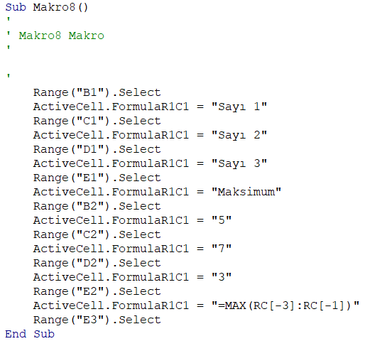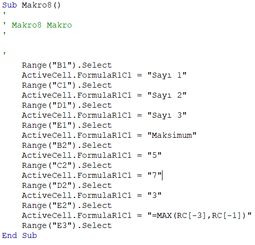 " ActiveCell.FormulaR1C1 " komutu hangi işlevi yerine getirir?