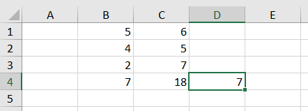 - Son olarak; D4 hücresi seçilir ve hücreye =MAK(B4;C4) formülü eklenir. Formülün sonucu B4 ve C4 hücrelerindeki değerlerin maksimumudur. Hücreye 18 eklenir.