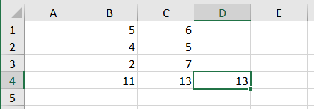- B4 hücresi seçilir ve hücreye =TOPLA(B1;B3) formülü eklenir. Formülün sonucu B1 ve B3 hücrelerindeki değerlerin toplamıdır. Hücreye 7 değeri eklenir.