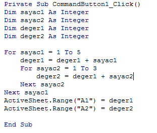 Görseldeki kod çalıştırıldığında sırasıyla A1 ve A2 hücrelerinde yazan değerler aşağıdakilerden hangisidir?