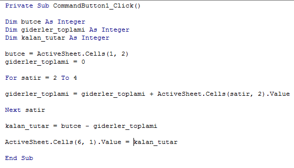 3. B2,B3 ve B4 hücrelerindeki değerler toplanıp, giderler_toplami değişkenine atanıyor.