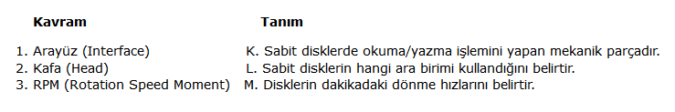 Yukarıda sabit disklerle ilgili verilen kavram ve tanımlarının doğru eşleştirmesi aşağıdakilerin hangisinde verilmiştir?