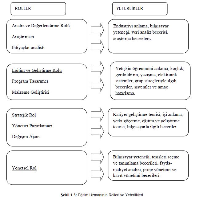 Amerikan Eğitim ve Geliştirme Derneği (ASTD), işletmelerde eğitim uzmanlarının rol ve yeterliklerinin oldukça geniş yelpazede yer aldığını belirtmiş ve eğitim uzmanlarından beklenen rol ve yeterliklerini Şekil 1.3.de sıralamıştır: