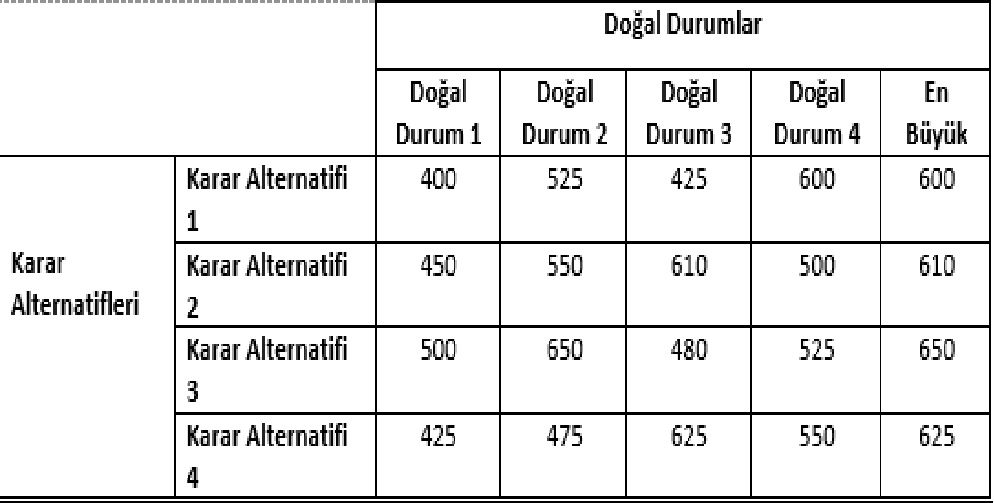 Her bir karar alternatifi için belirlenen en büyük değerler arasından (600, 610, 650, 625) en büyüğüne sahip alternatif iyimserlik ölçütüne göre en iyi karardır. Tablo'nun son sütununda yer alan değerlerden en büyüğü 650’ye eşittir ve bu değer 3. karar alternatifinin değeridir. Dolayısıyla iyimserlik ölçütüne göre karar vericinin seçmesi gereken Karar Alternatifi 3’tür. Doğru cevap C'dir.