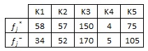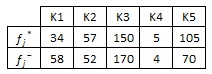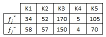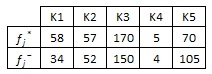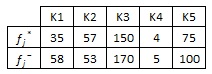 Kriterin özelliği dikkate alınarak (min/max) her kriter için en iyi (fj*) ve en kötü (fj-) değerler belirlenir. En iyi (fj*) değerleri; K1 ve K2 için min olan değerler, K3, K4 ve K5 için max olan değerlerdir. En kötü (fj-) değerleri K1 ve K2 için max olan değerler, K3, K4 ve K5 için min olan değerlerdir.