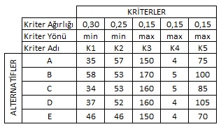 Beş alternatifin beş kritere göre değerlendirildiği karar problemine ilişkin karar matrisi aşağıdaki gibidir. Karar Problemi VIKOR tekniği kullanılarak çözülmek istenmektedir.