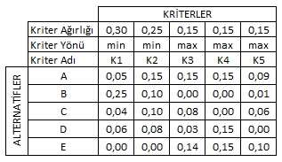 Bir önceki adımda normalize edilmiş değerler, kriterlerin önem derecelerini gösteren ağırlıkları ile çarpılır. |