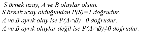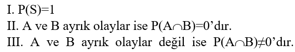 S örnek uzay, A ve B olaylar olmak üzere aşağıdaki ifadelerden hangileri doğrudur?